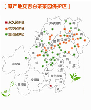 安吉白茶茶园划分为天荒坪镇大溪村永久保护区1000多亩,递铺街道古城社区等核心保护区11万多亩,递铺街道青龙村等重点保护区3万多亩左右。
